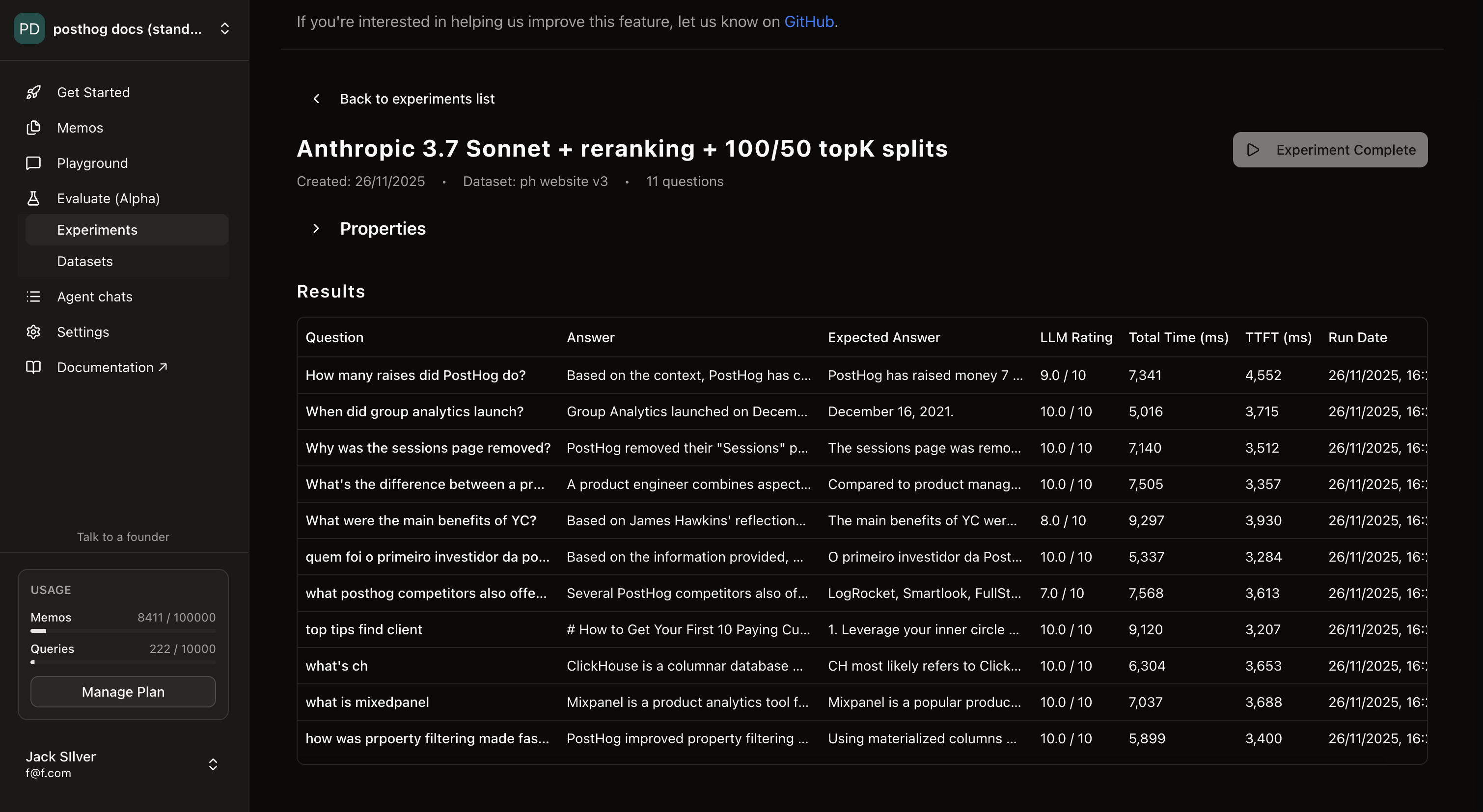 [1] I used the PostHog website here because the website content is MIT-licensed (yes, wild) and readily-available as markdown on GitHub and having worked there I know a lot of answers off the top of my head making it a great dataset of ~2000 documents that I know well.